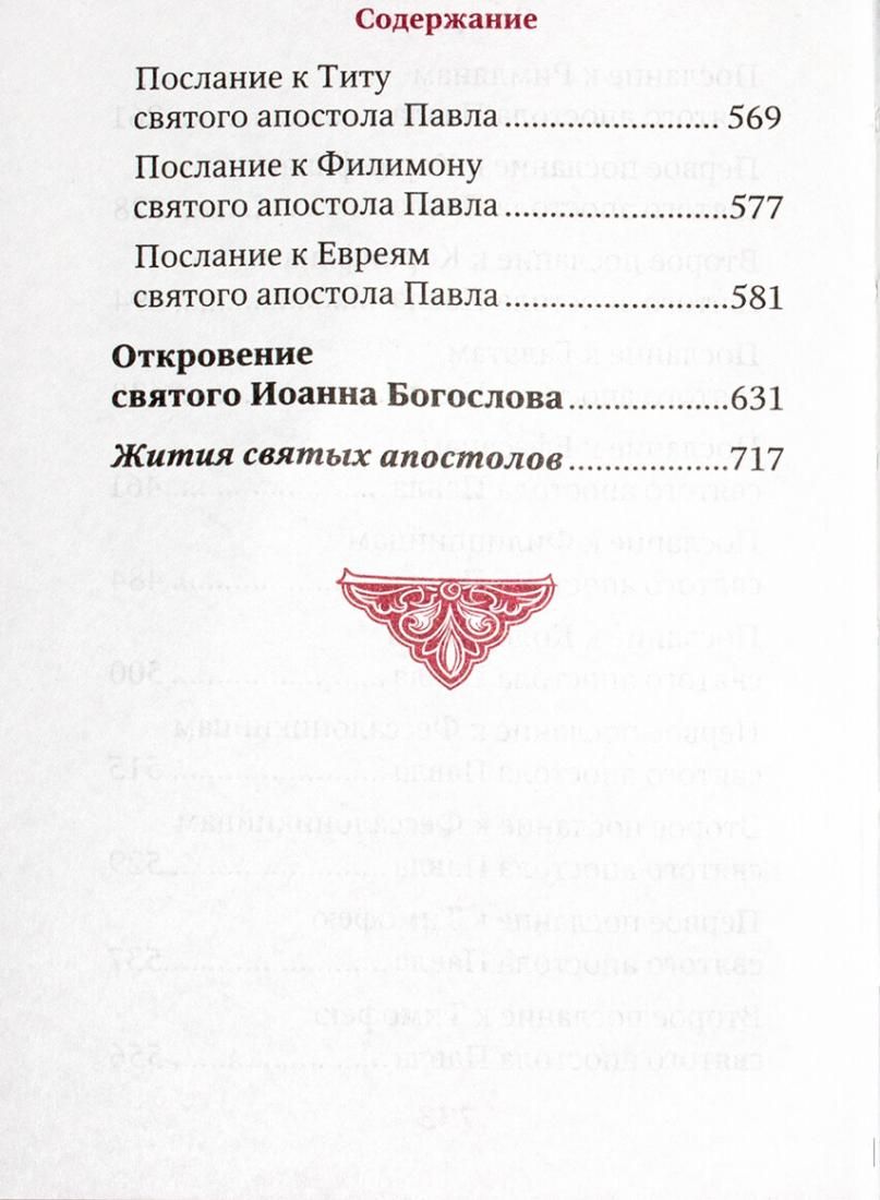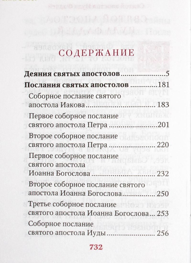 Книга «Апостол» включает Деяния святых апостолов, соборные послания апостолов Иакова, Петра, Иоанна Богослова и Иуды, а также 14 посланий апостола Павла.Книга издана в двухцветном полиграфическом исполнении и содержит зачала апостольских чтений согласно богослужебной практике Русской Православной Церкви.