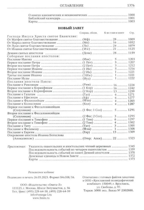 Издание большого формата в твердом переплете с блинтовым тиснением и с тиснением золотой фольгой. Указатели ветхозаветных, евангельских и апостольских церковных чтений. Чёрно-белые географические карты. По благославению Святейшего Патриарха Московского и всея Руси Кирилла, отпечатано по оригиналу-макету, предоставленному Издательским Советом Русской Православной Церкви. ISBN 978-5-370-05295-8 Офсетная бумага, 1376 страниц, большой формат. Твердый переплет. Размеры книги: 265 мм на 210 мм на 60 мм Вес: 2330 гр.