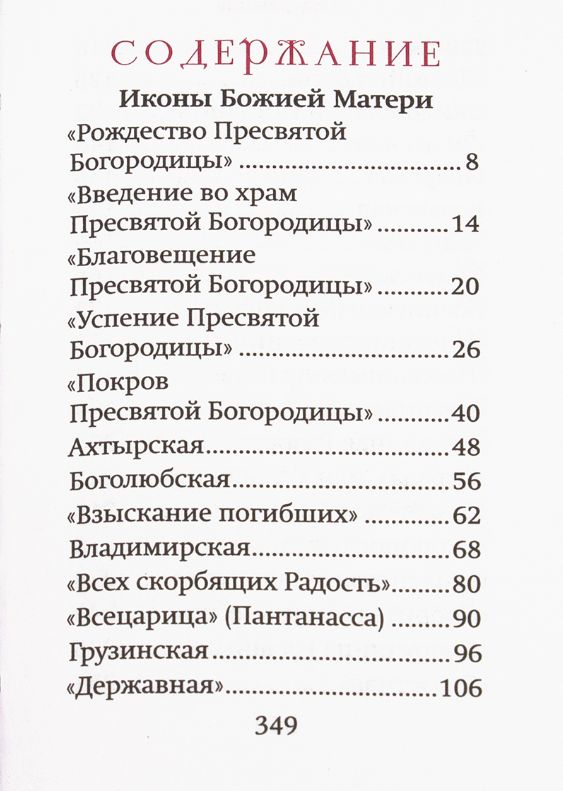 Книга содержит тропари, кондаки, величания и молитвы перед 44 наиболее известными чудотворными иконами Пресвятой Богородицы. Также в ней рассказывается о происхождении этих икон и о том, где сейчас находятся подлинники; о дате празднования в честь того или иного образа в Православной Церкви.