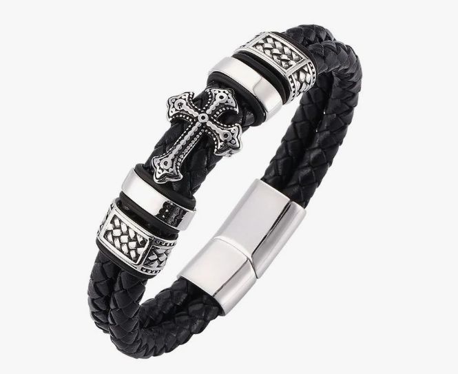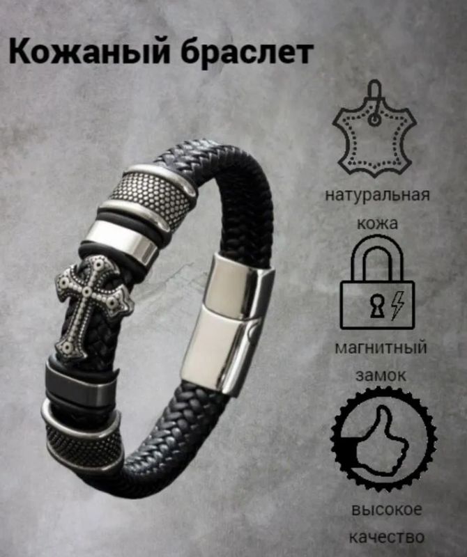 Черный кожаный браслет с крестом на магнитном клапане. Новый в упаковке. Цвет кожи - черный. Цвет вставок - серебро/хром. Бижутерный сплав, кожа. Внутренний диаметр - 6 см. Длина - 21 см.