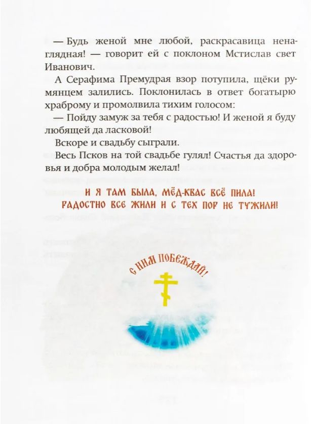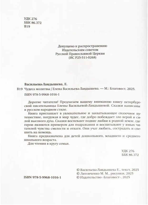 - Отличный выбор для семейного чтения или как подарок, который оставит теплое впечатление надолго. Предлагаем вашему вниманию удивительную книгу от петербургской писательницы Елены Васильевой-Ландышевой. Эта книга станет прекрасным подарком для детей, представляя собой сочетание христианской литературы и волшебных сказок. Написанные в русском народном стиле, истории приглашают детей в захватывающее путешествие, где добро неизменно побеждает зло силой веры и высокого духа. Эти сказки воспевают подвиг любви к родной земле. Юные герои, являясь примером для подражания, воспитывают у детей чувства смелости и отваги. Они учат любить, сострадать и всегда спешить на помощь. Эта литература прекрасно подходит для детей дошкольного и младшего школьного возраста, особенно для чтения в кругу семьи. Истории в книге помогают детям постичь азы православной веры, поддерживая их интерес к православию. Это издание создаст атмосферу праздника на Пасху или Рождество, делая его замечательным подарком к любому православному празднику. Книга идеально подходит для воспитания детей, добавляя в их жизнь элемент чуда и доброты. Православные ценности, описанные в книге, важны для формирования характера и духа детей, делая их жизни богаче и значимее. Очарование этих детских сказок надолго останется в сердцах юных читателей.