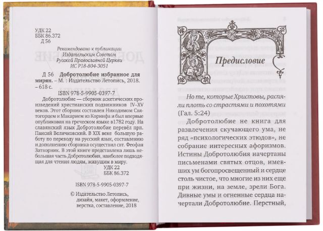 Добротолюбие - не книга для развлечения скучающего ума, не ряд "психологических этюдов", не собрание интересных афоризмов. Истины Добротолюбия начертаны письменами святых отцов, имевших ум богопросвещенный и сердце столь чистое, что многие из них еще при жизни, на земле, зрели Бога. Дивные умы и огненные сердца начертали Добротолюбие. Перстный, суетный человек только тогда приобретет эту жемчужину духа, войдет в чертог царственного пира, когда смиренно, сознав немощь ума своего, пятна и раны на сердце своем, с молитвою к Духу Святому раскроет страницы Добротолюбия. Тогда только, при содействии огненного и очищающего Духа Божия, найдет перстный человек здесь, на земле: мир ума, благочиние чувств, вступит на путь радостного и бесконечного добра; одним словом, приобщится к жизни великих отцов и врачей человеческих душ, радость и светлость жизни которых бессильно выразить немощное слово человеческое. Рекомендовано к публикации Издательским Советом Русской Православной Церкви.