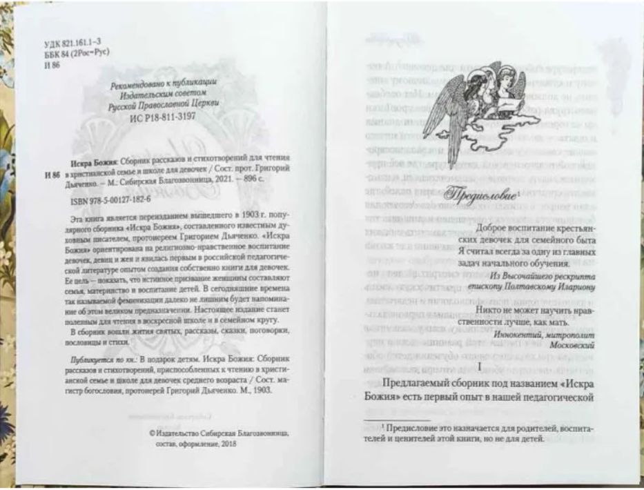 Эта книга является переизданием вышедшего в 1903 г. популярного сборника "Искра Божия", составленного известным духовным писателем, протоиереем Григорием Дьяченко. "Искра Божия" ориентирована на религиозно-нравственное воспитание девочек, девиц и жен и явилась первым в российской педагогической литературе опытом создания собственно книги для девочек. Ее цель - показать, что истинное призвание женщины составляют семья, материнство и воспитание детей. В сегодняшние времена так называемой феминизации далеко не лишним будет напоминание об этом великом предназначении. Настоящее издание станет полезным для чтения в воскресной школе и в семейном кругу. В сборник вошли жития святых, рассказы, сказки, поговорки, пословицы и стихи.