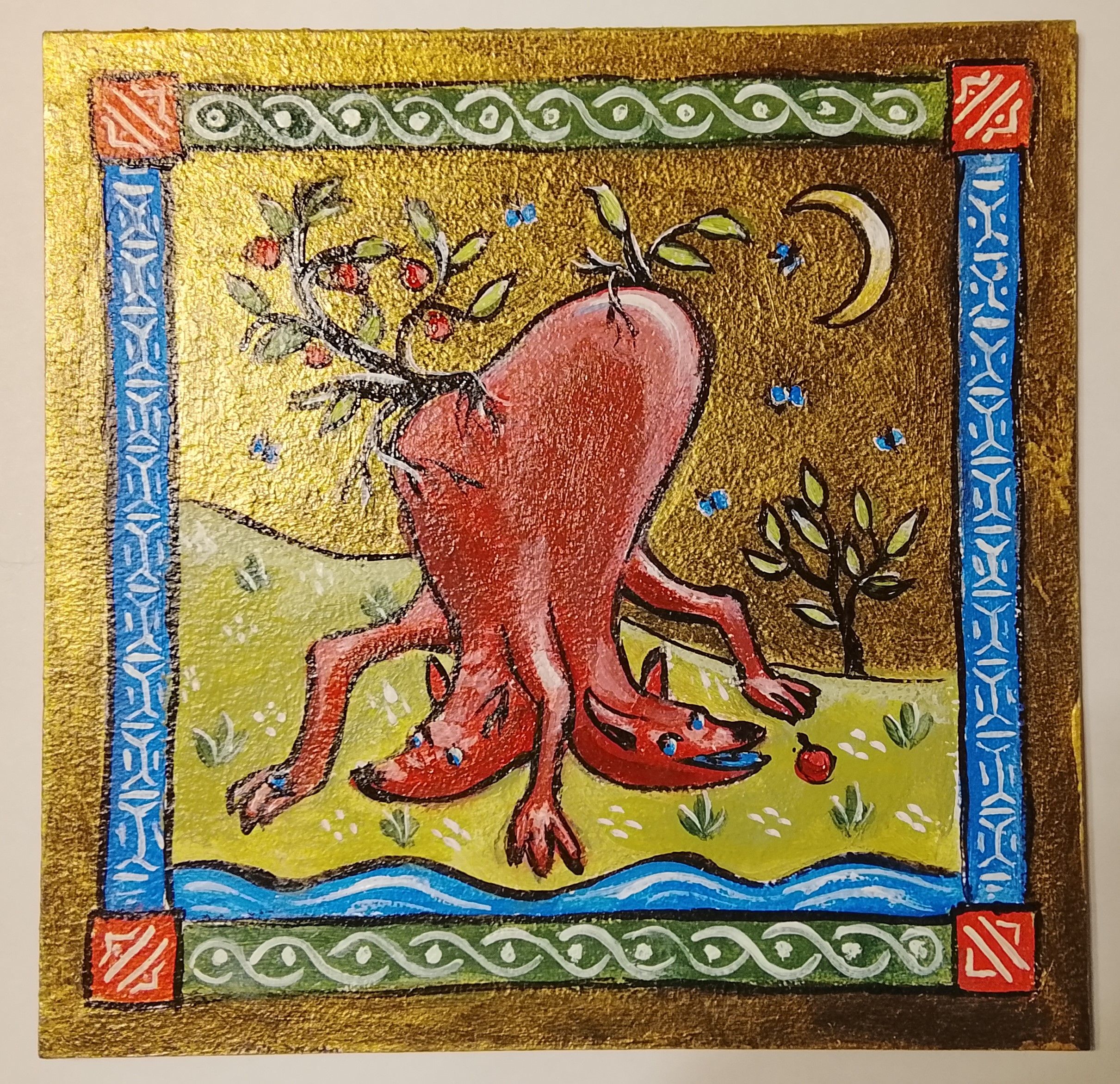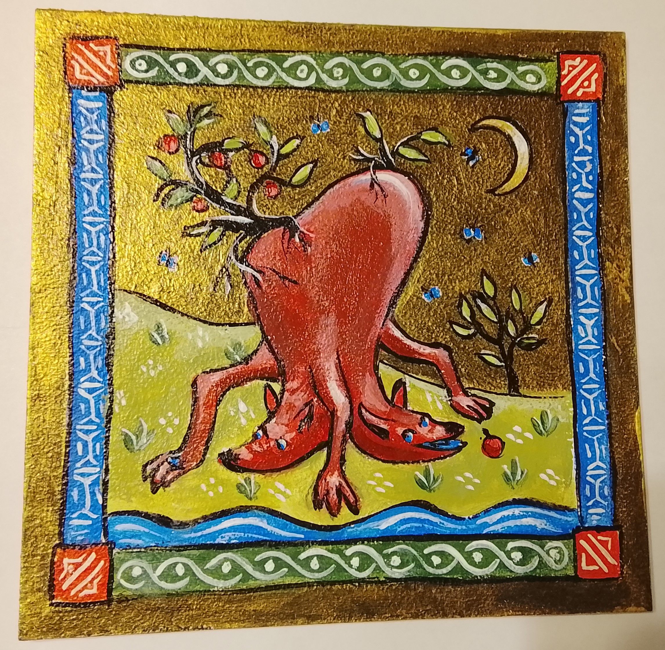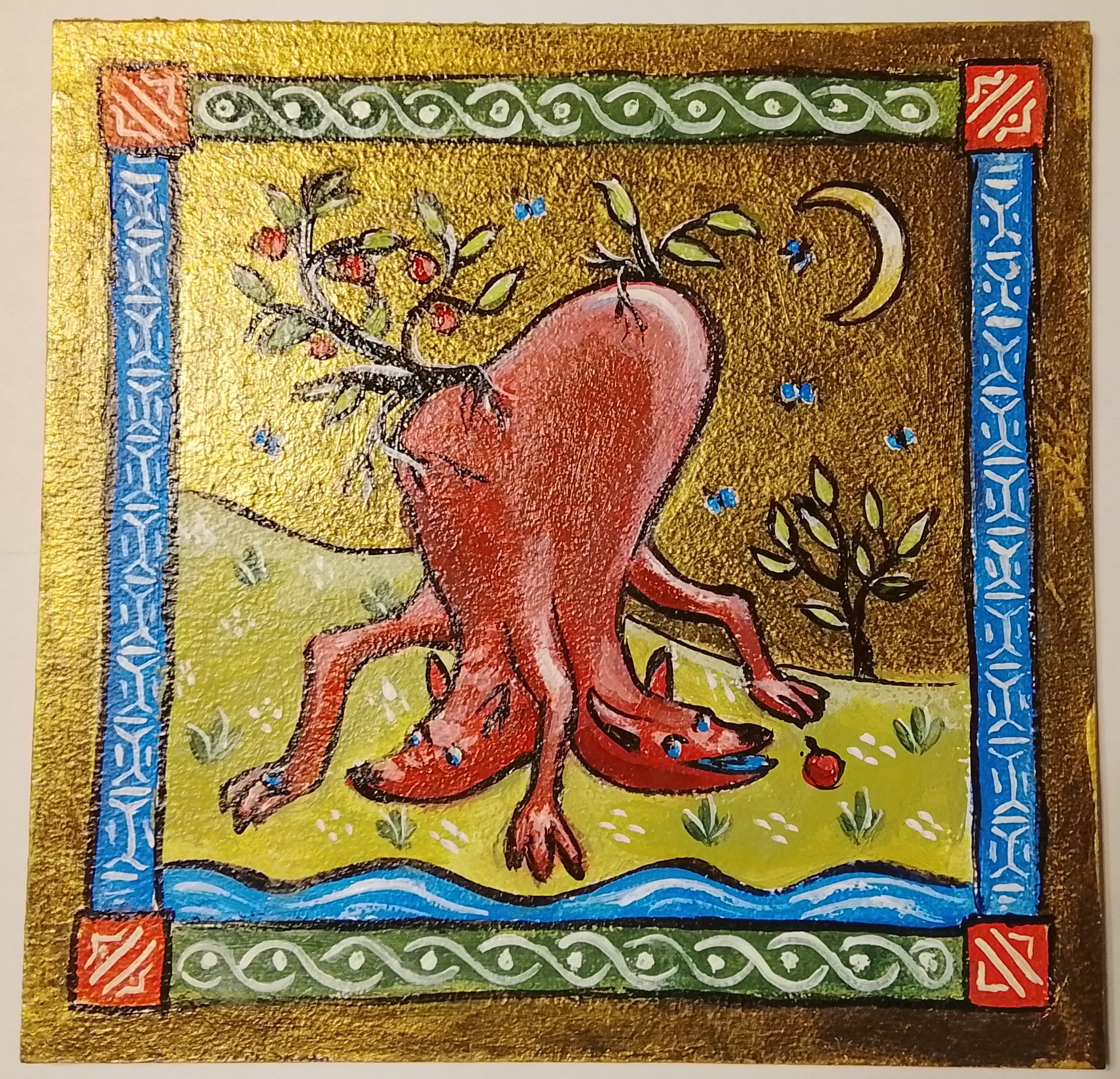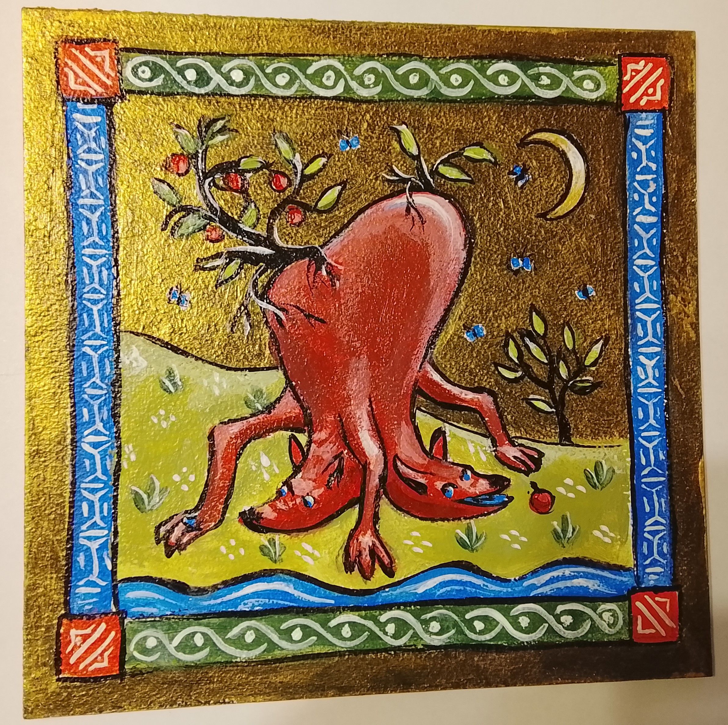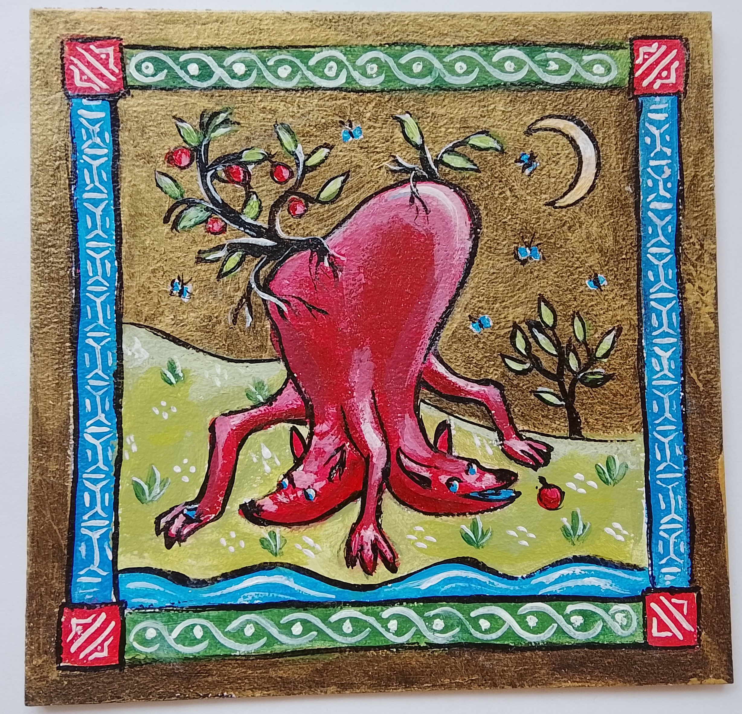Авторская картина «Двуглавое животное с яблоками» выполнена в технике золотого акрила на картоне. Работа принадлежит к серии фантастических вымышленных существ, где реалистичные детали переплетаются с элементами воображения.