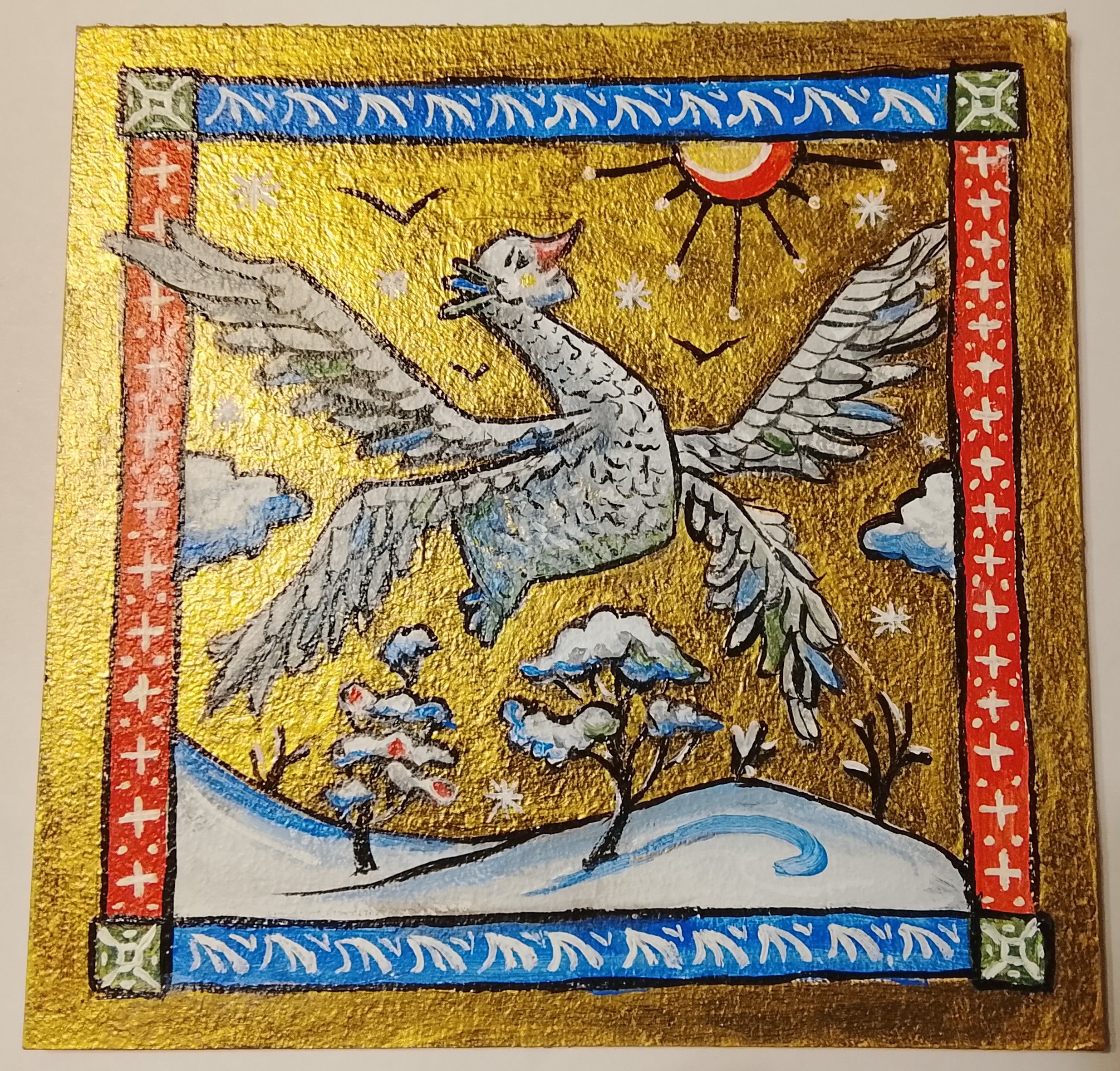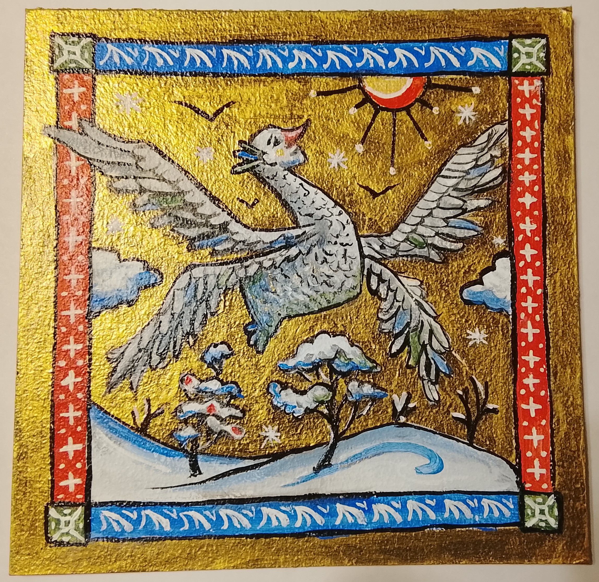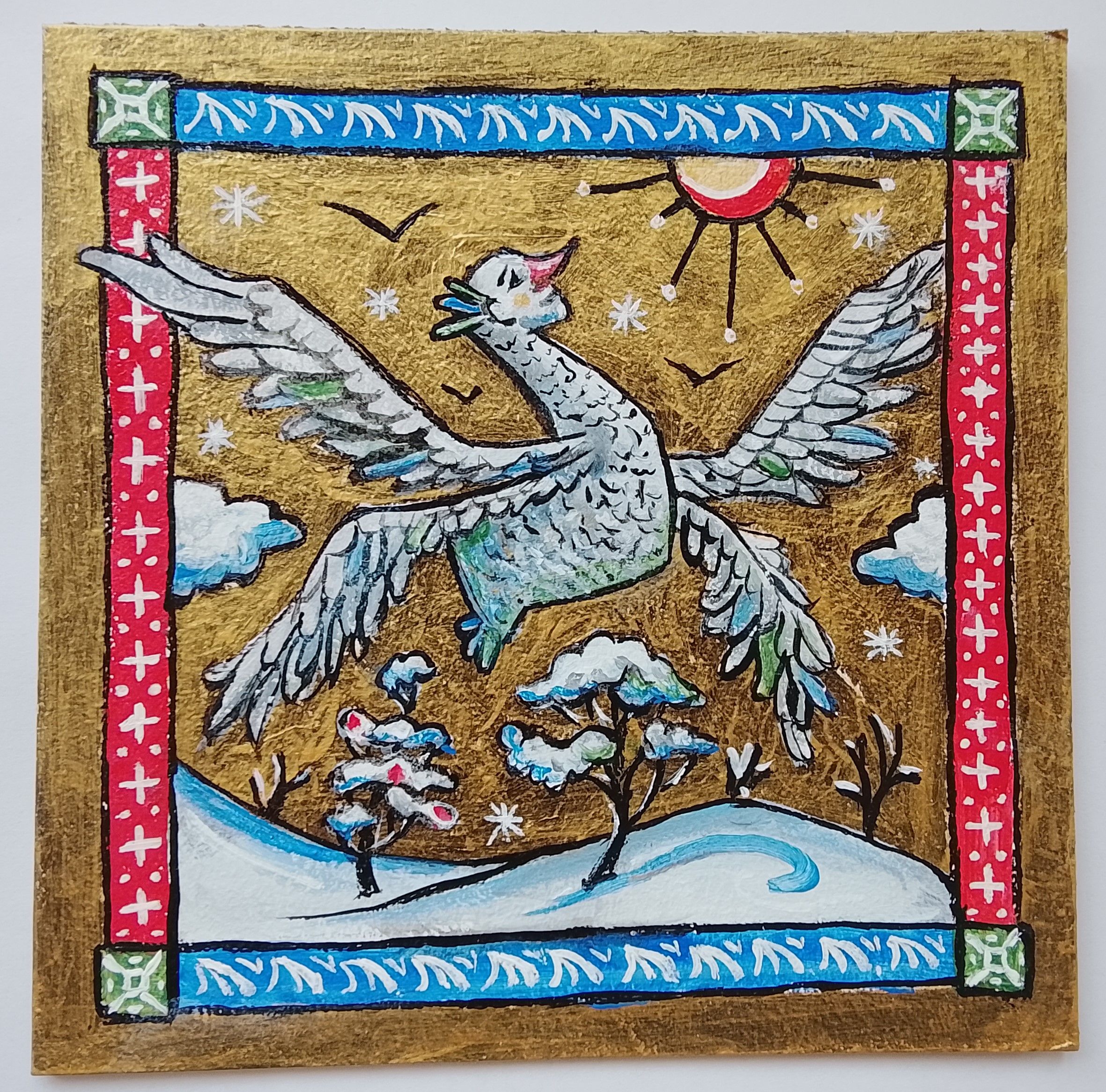 Авторская картина «Птица белая в лучах солнца зимой» выполнена золотым акрилом на плотном картоне. Яркий образ фантастического существа сочетает нежность формы и холодную энергию зимнего света, создавая эффект мерцающего сияния.