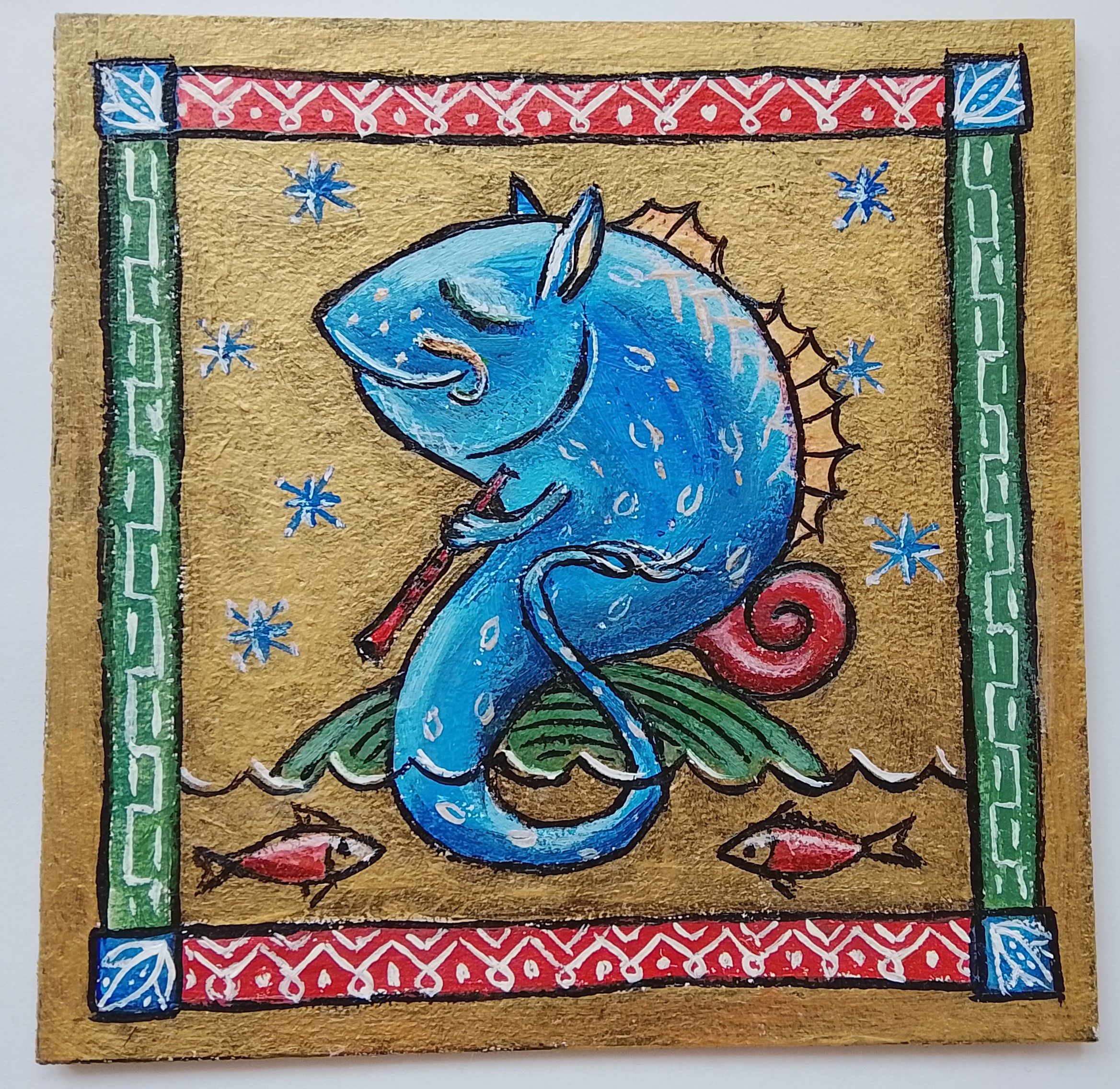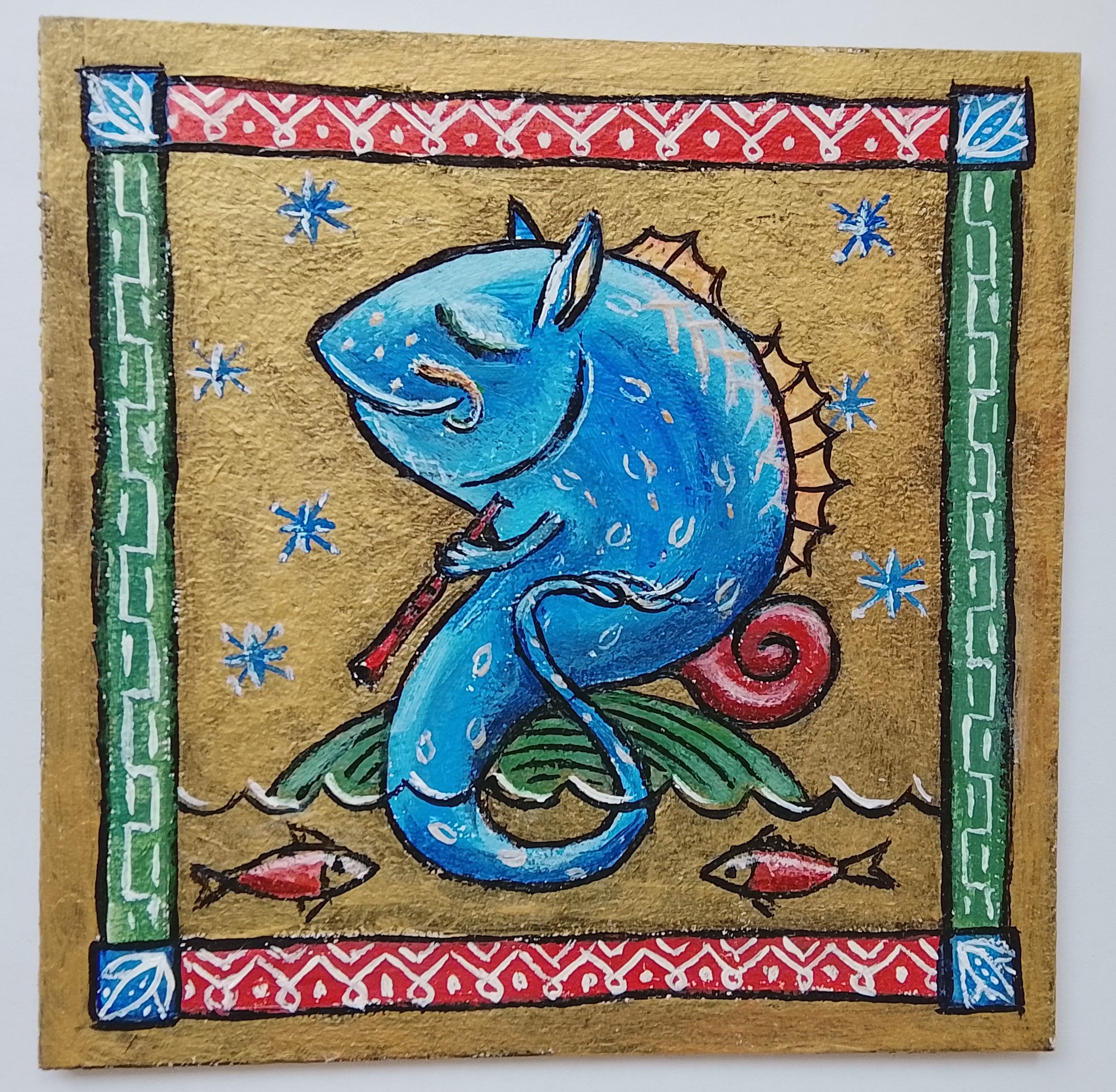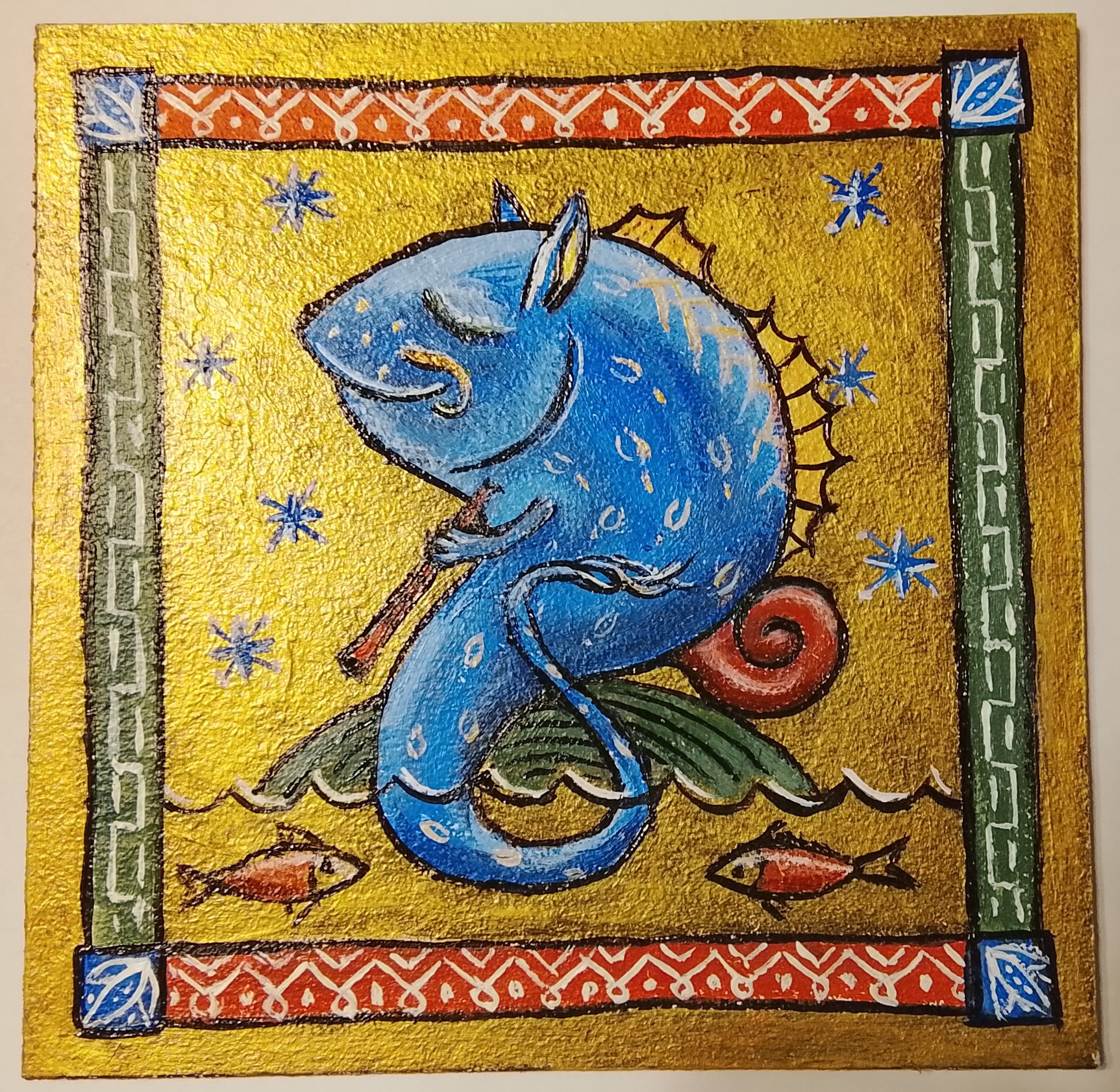 Авторская картина ручной работы "Рыба с дудочкой".Золотой акрил на картоне