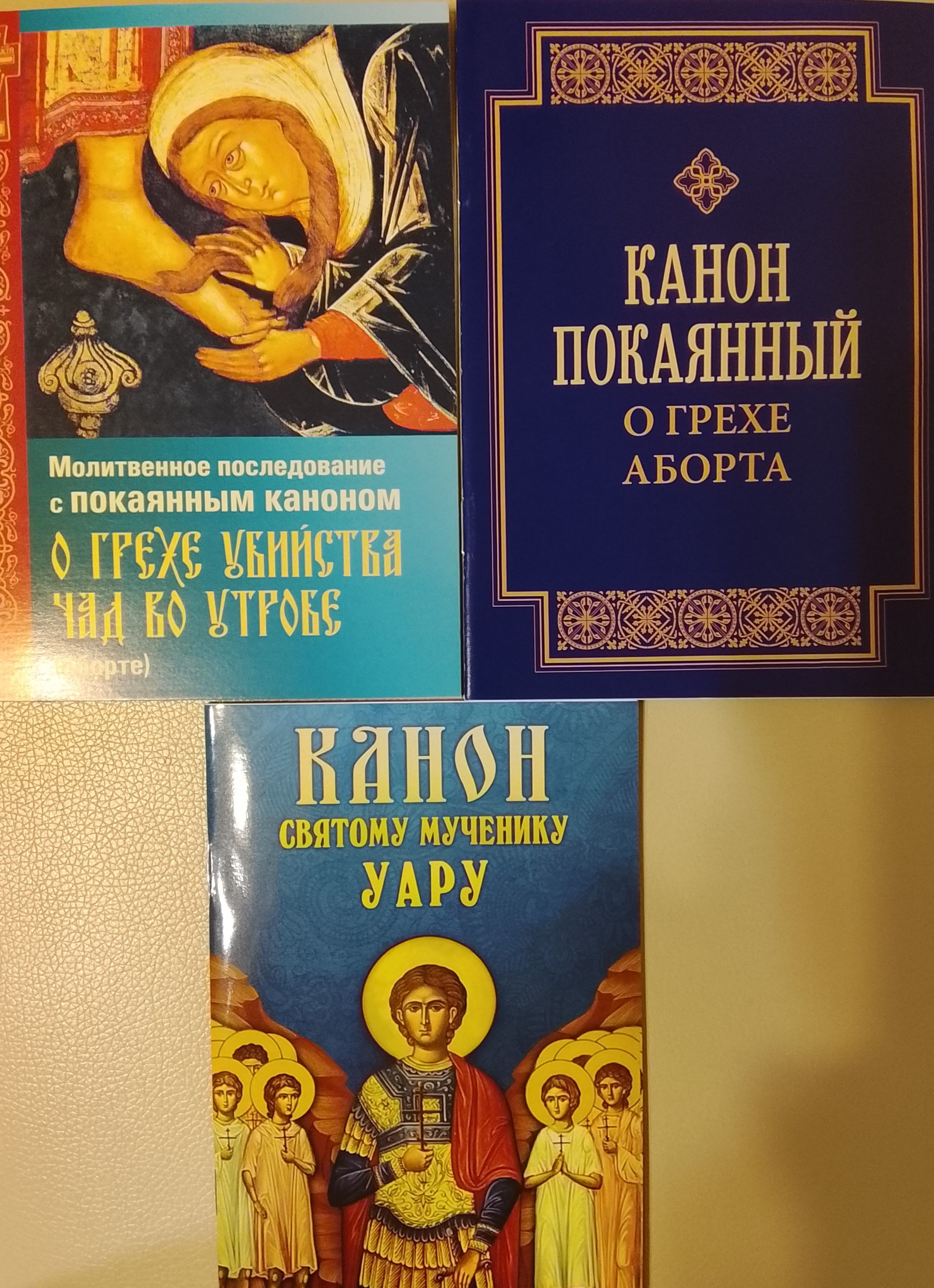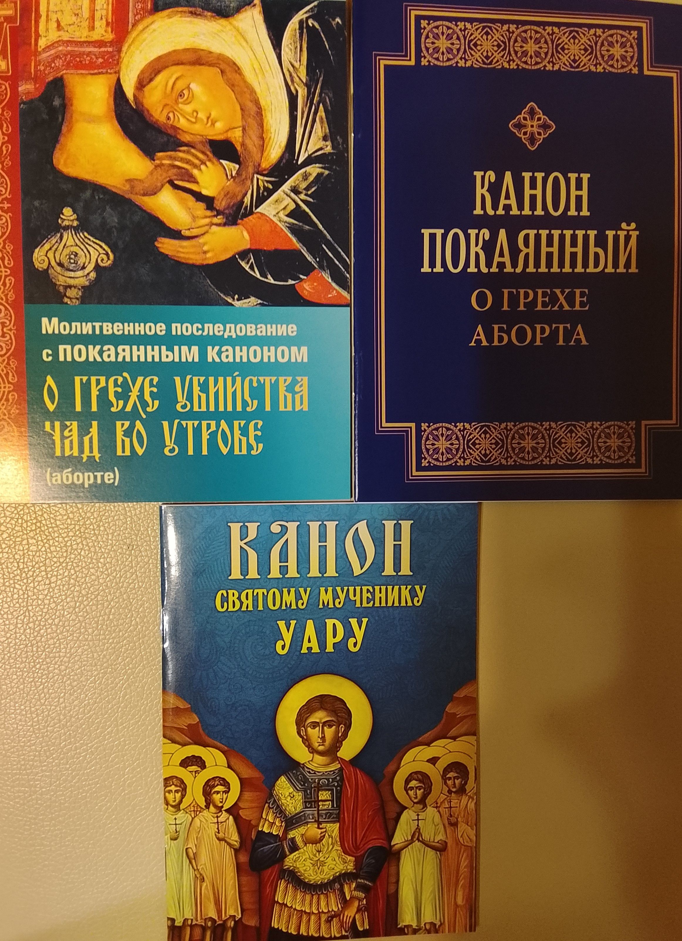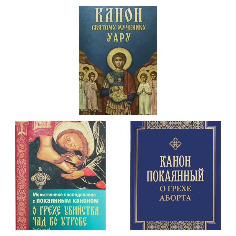 1. Молитвенное последование с покаянным каноном о грехе убийства чад во утробе (аборте). Мягкая обложка, газетная бумага, 31 стр. размеры 120 мм на 165 мм. Издательство Прихода храма Св. Духа Сошествия на Лазаревском кладбище (Москва), 2024 год.