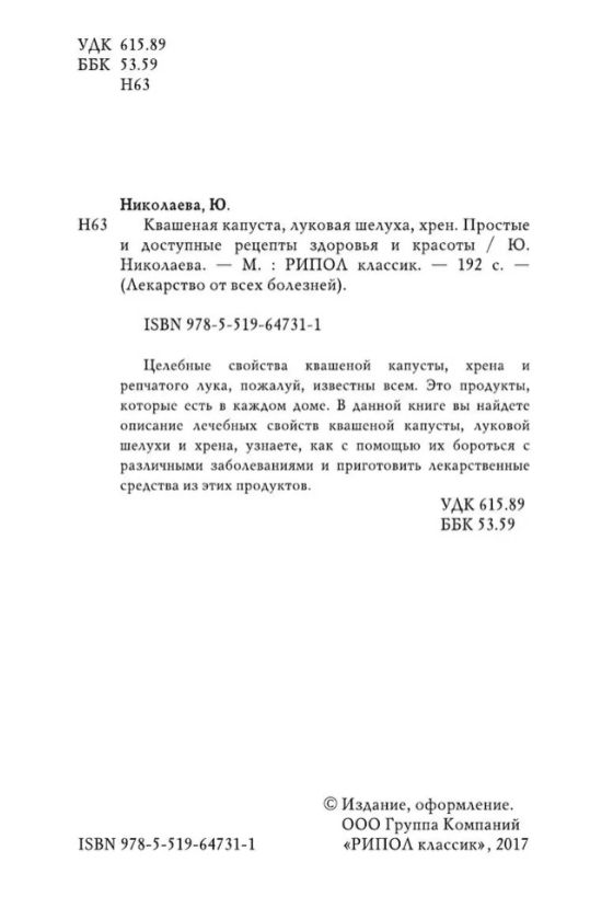 Печатная книга «Квашеная капуста, луковая шелуха, хрен. Простые и доступные рецепты здоровья и красоты» в мягкой обложке, язык - русский. В книге 192 страниц, она напечатана на белой офсетной бумаге плотностью 80 г/м². Формат издания — 148x210 мм. Все книги аккуратно упаковываем в прочный трёхслойный непрозрачный картонный конверт.