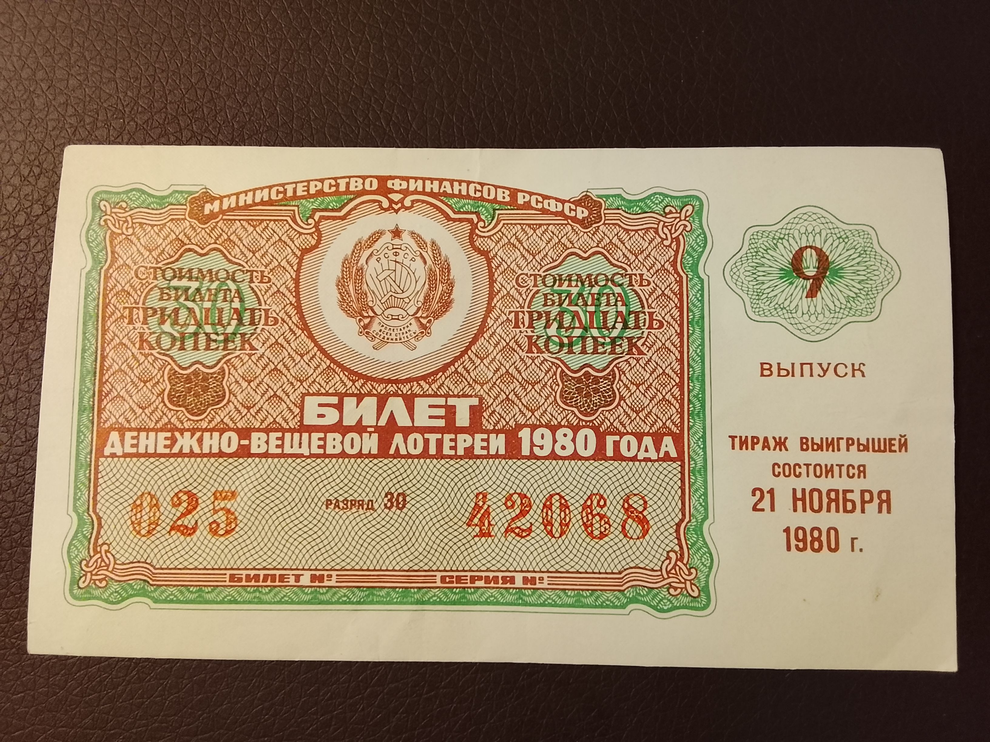 Лотерейный билет денежно-вещевой лотереи СССР 1980 года