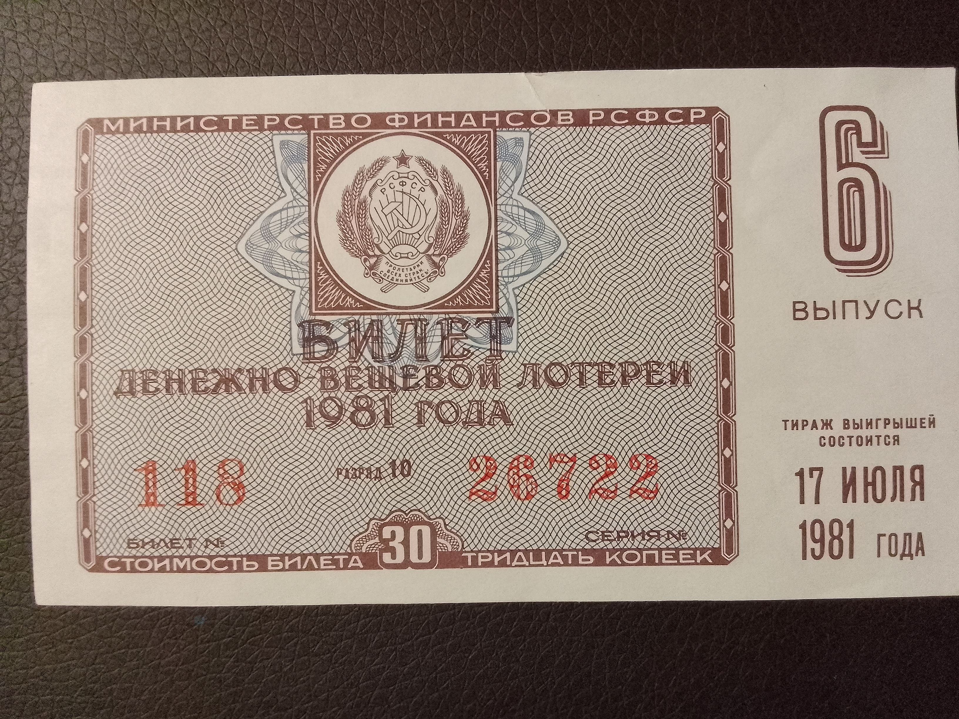 Лотерейный билет денежно-вещевой лотереи СССР 1981 года — редкий артефакт эпохи, сохранивший оригинальный вид и четкость печати. Шестой выпуск того времени стал частью культурной истории, отражая бытовую реальность и надежды советских граждан.