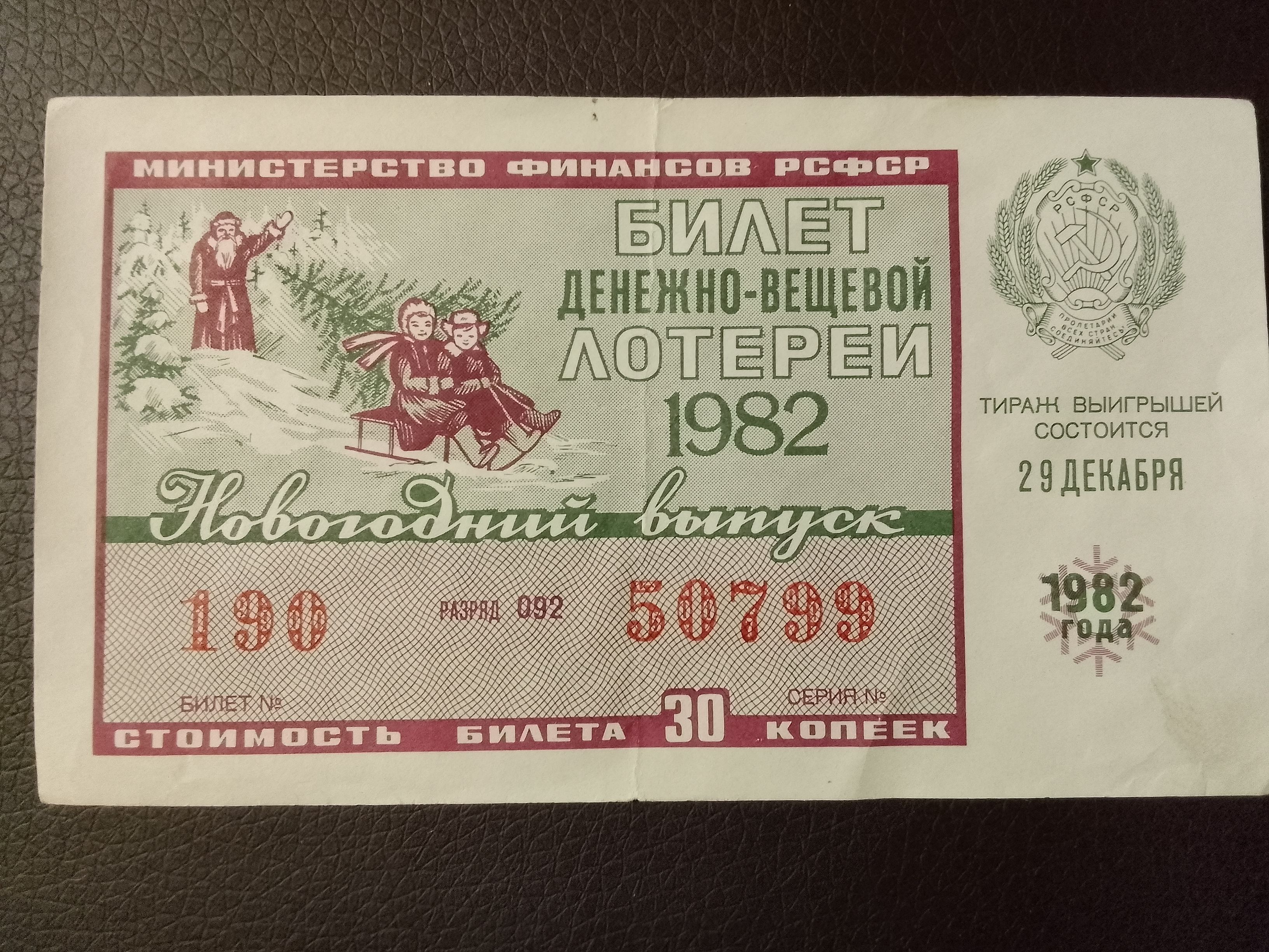 Лотерейный билет денежно-вещевой лотереи СССР 1982 год 29 декабря Новогодний выпуск