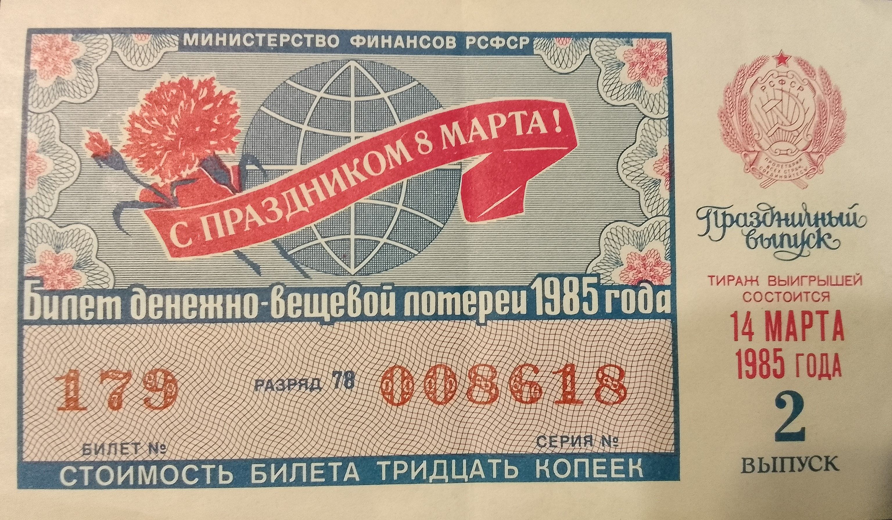 - Редкий экземпляр с сохранившейся типографской печатью и характерным дизайном советских лотерейных билетов