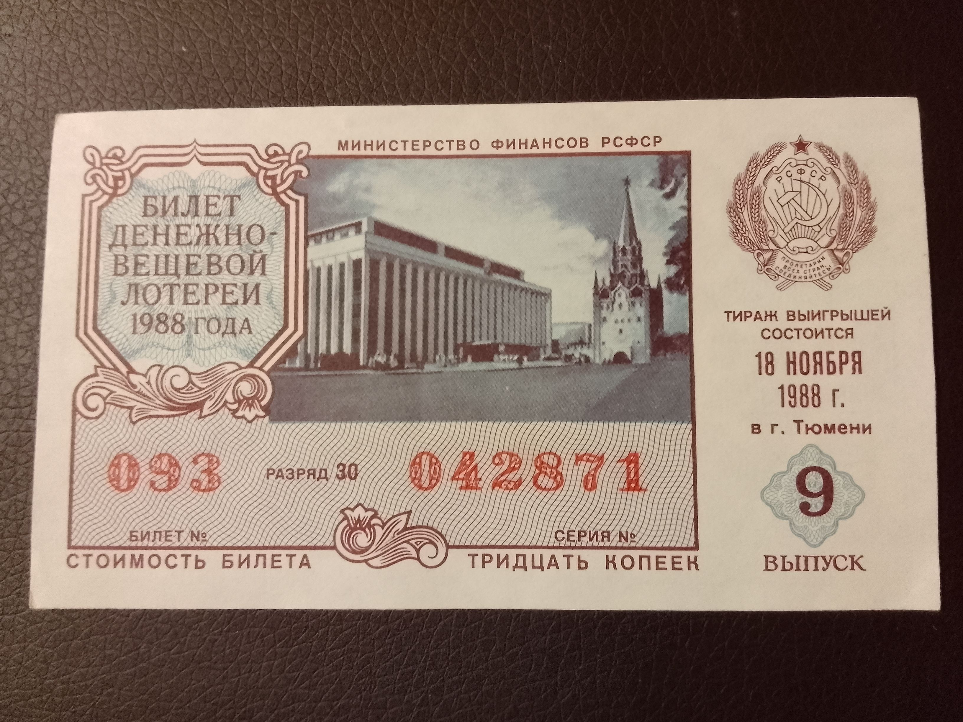 Лотерейный билет денежно-вещевой лотереи СССР 1988 год