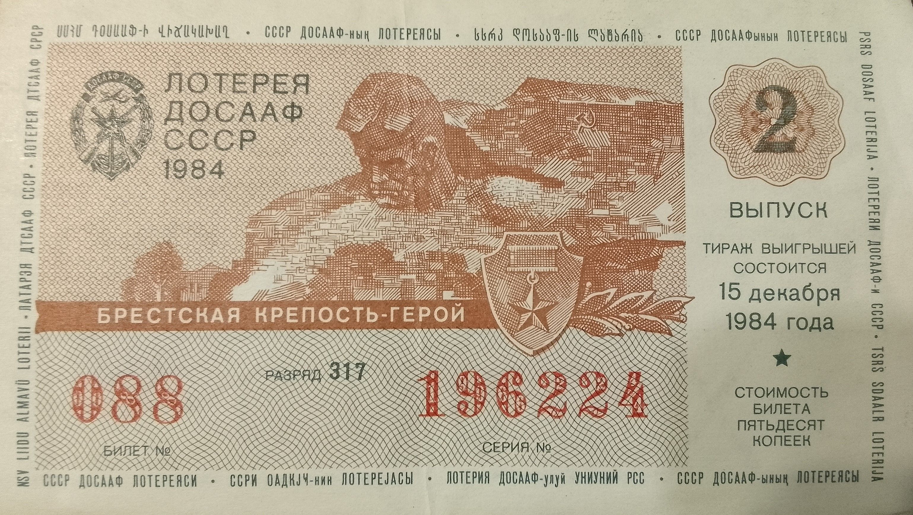 Лотерейный билет ДОСААФ СССР 1984 год Бресткая крепость-герой Выпуск 2- Исторический артефакт эпохи СССР, связанный с культурными традициями празднования международного женского дня
