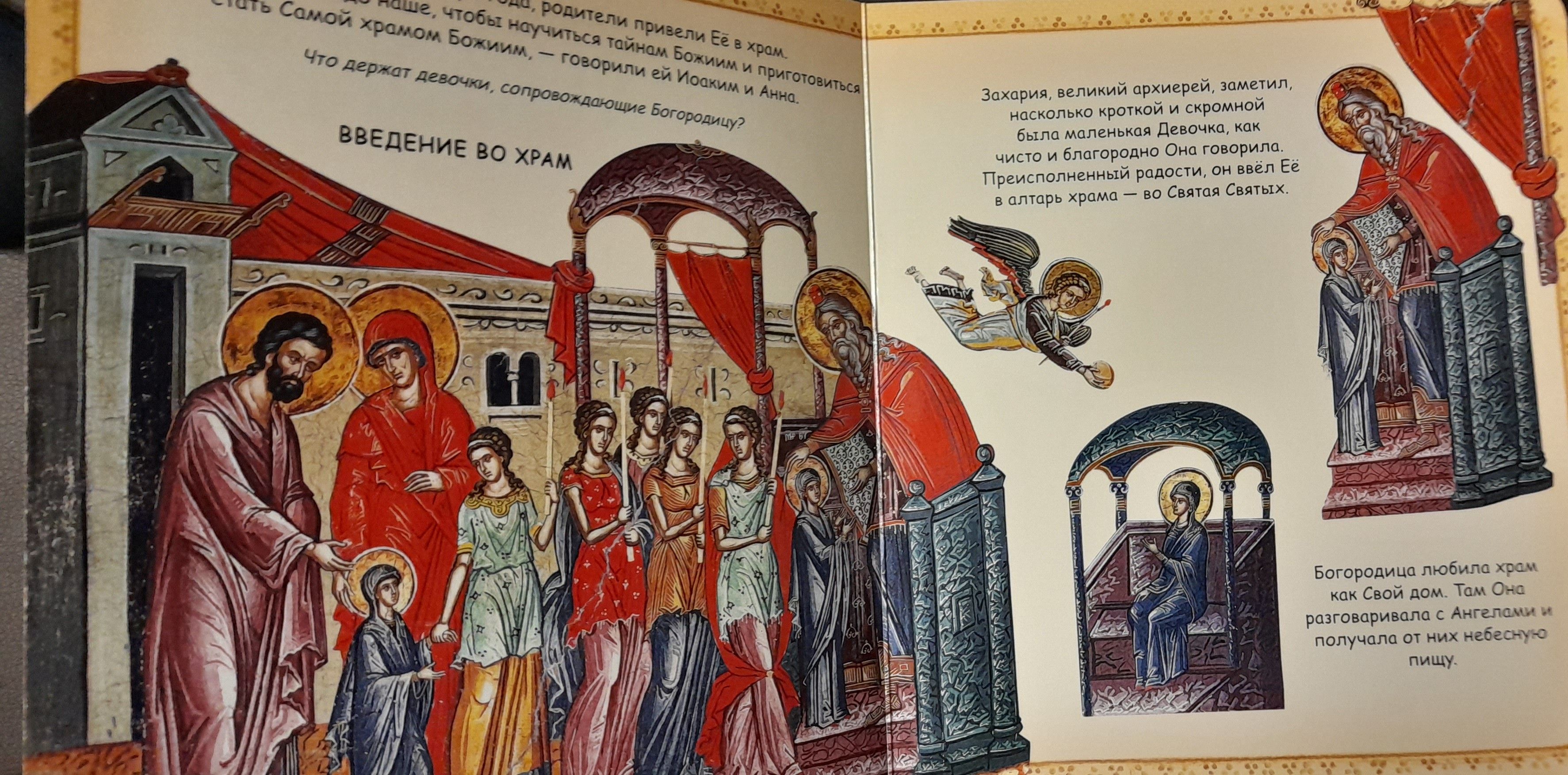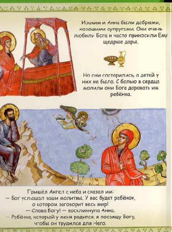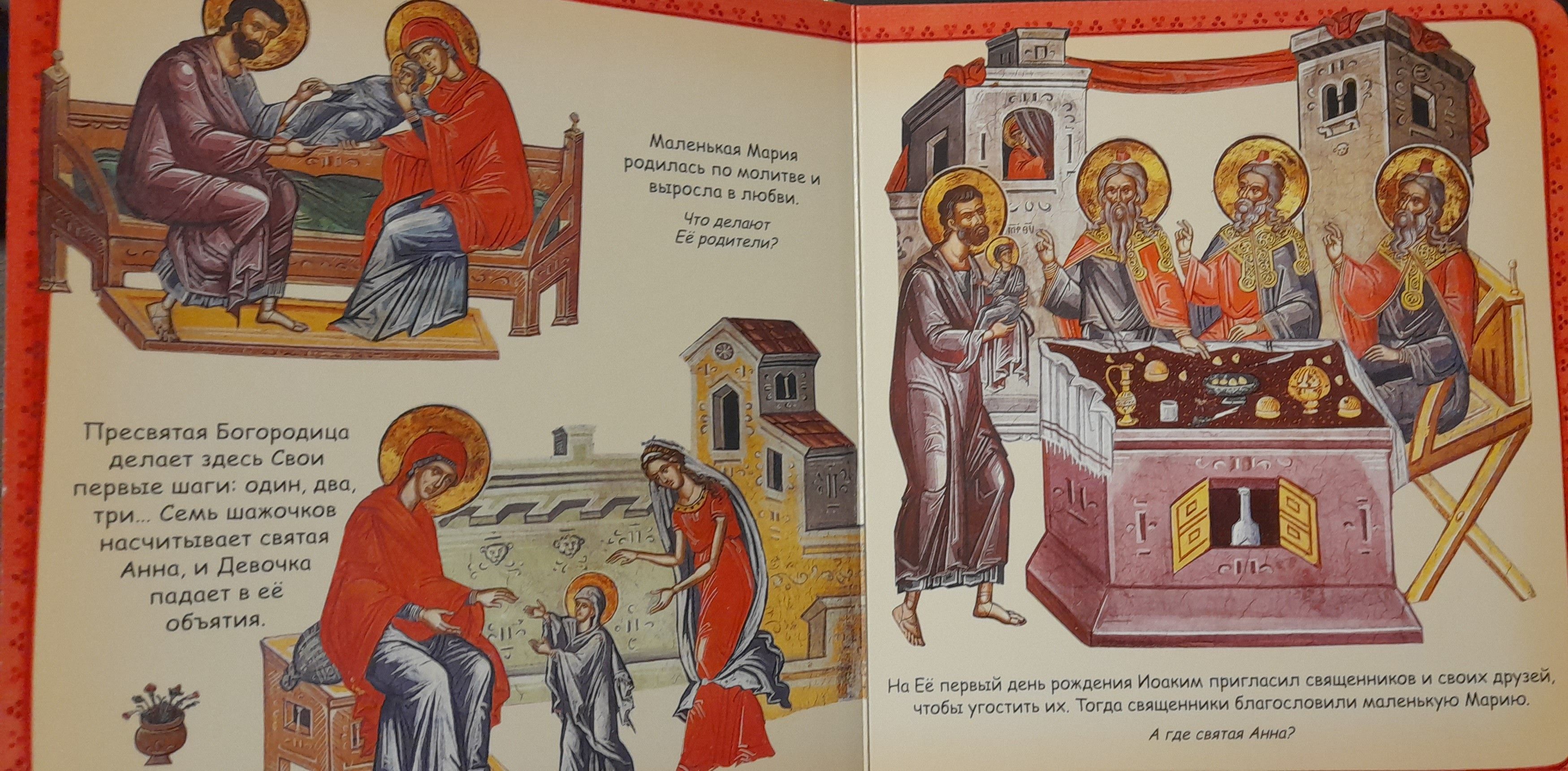 Кто были родители Матери Божией? Что сделал Христос по просьбе Богоматери? Как изображается Ее душа? Дети узнают о жизни Божией Матери, смотря на фрески работы иконописца Джорджи из собора монастыря Святого Дионисия на Горе Афон. Одновременно они совершат великолепное путешествие в мир византийского искусства, которое очень близко детской душе. Это драгоценное сокровище с великой любовью нам предоставила священная обитель Святого Дионисия, с пожеланием, чтобы сами иконы обращались к душам наших детей.