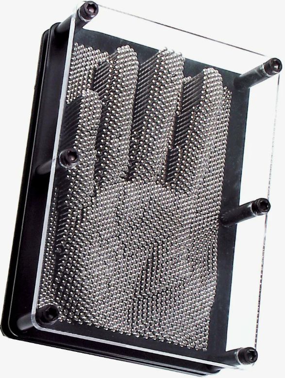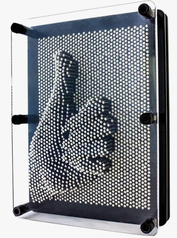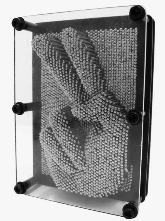 Экспресс-скульптор "PinART", 15.2 х 4.8 х 18.5 см — прибор, представляющий собой пластину-основание, на которой закреплены несколько сотен металлических стерженьков-гвоздиков, закрытых прозрачной передней панелью.
