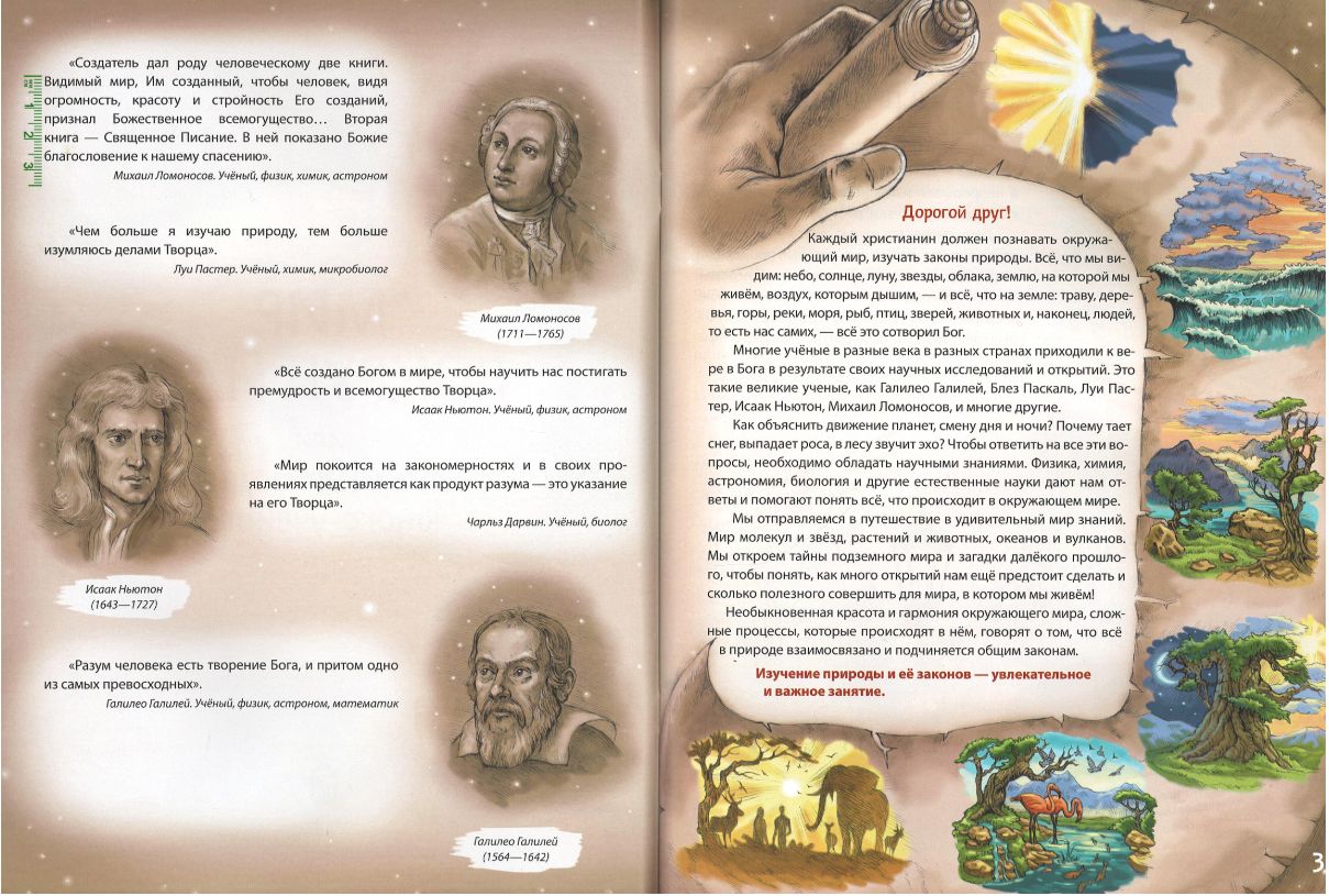 Издание подготовлено при участии Белорусской Православной Церкви, что подчёркивает заботу о духовно-нравственном развитии читателей. Подходит для школьников, желающих расширить кругозор и развивать научное мышление. Каждый христианин должен познавать окружающий мир, изучать законы природы. Всё, что мы видим: небо, солнце, луну, звезды, облака, землю, на которой мы живем, воздух, которым дышим, — и всё, что на земле: траву, деревья, горы, реки, моря, рыб, птиц, зверей, животных и, наконец, людей, то есть нас самих, — всё это сотворил Бог. Многие ученые в разные века в разных странах приходили к вере в Бога в результате своих научных исследований и открытий. Это такие великие ученые, как Галилео Галилей, Блез Паскаль, Луи Пастер, Исаак Ньютон, Михаил Ломоносов, и многие другие. Как объяснить движение планет, смену дня и ночи? Почему тает снег, выпадает роса, в лесу звучит эхо? Чтобы ответит на все эти вопросы, необходимо обладать научными знаниями. Физика, химия, астрономия, биология и другие естественные науки дают нам ответы и помогают понять всё, что происходит в окружающем мире. Мир молекул и звезд, растений и животных, океанов и вулканов. Мы откроем тайны подземного мира и загадки далекого прошлого, чтобы понять, как много открытий нам еще предстоит сделать и сколько полезного совершить для мира, в котором мы живем! Необыкновенная красота и гармония окружающего мира, сложные процессы, которые происходят в нем, говорят о том, что всё в природе взаимосвязано и подчиняется общим законам. Изучение природы и её законов — увлекательное и важное занятие.