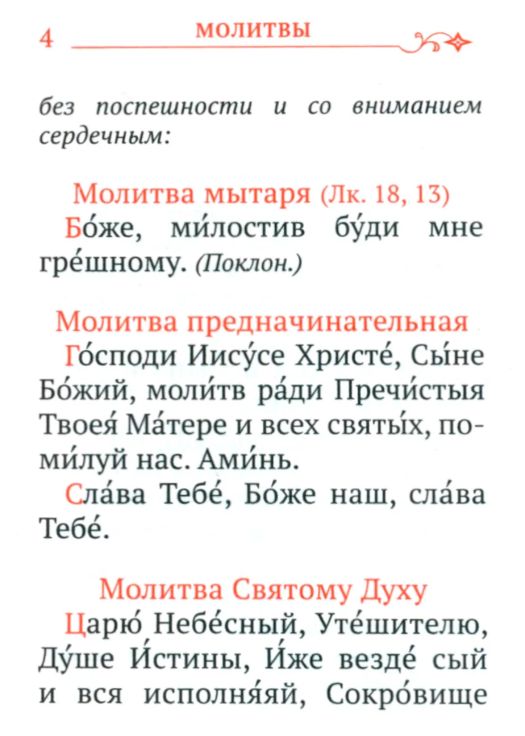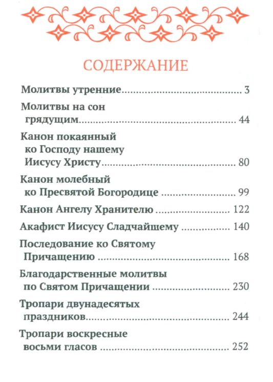 В книгу вошли: Молитвы утренние; Молитвы на сон грядущим; Канон покаянный ко Господу нашему Иисусу Христу; Канон молебный ко Пресвятой Богородице; Канон Ангелу Хранителю. Акафист Иисусу Сладчайшему; Последование ко Святому Причащению; Благодарственные молитвы но Святом Причащении; Тропари двунадесятых праздников; Тропари воскресные восьми гласов и другие молитвы.