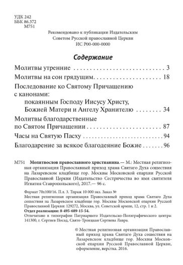 Молитвослов содержит молитвы утренние, молитвы на сон грядущим, последование ко святому Причащению с канонами, молитвы благодарственные по Святом Причащении, Часы на Святую Пасху, благодарение за всякое благодеяние Божие.