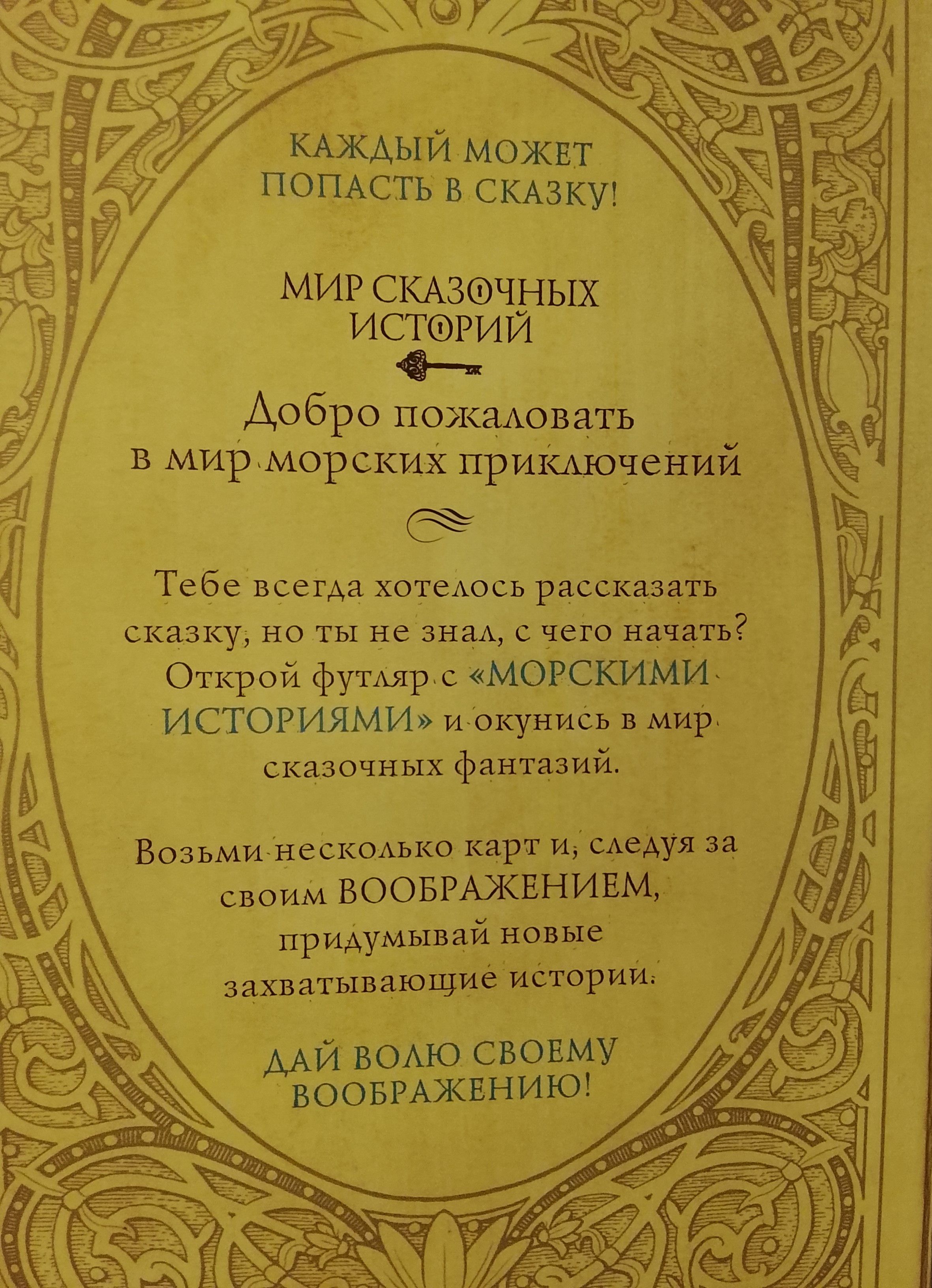 В комплект «Морских историй» входят 28 карт «Мира Сказочных Историй», собранные с семи морей. На картах изображены персонажи, места и предметы, которые встречает путешественник в мире фантазий.