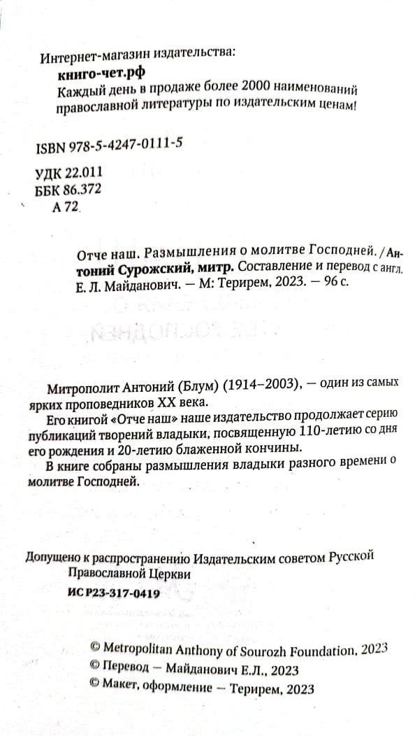Его книгой «Отче наш» наше издательство продолжает серию публикаций творений владыки, посвященную 110-летию со дня его рождения и 20-летию его блаженной кончины.