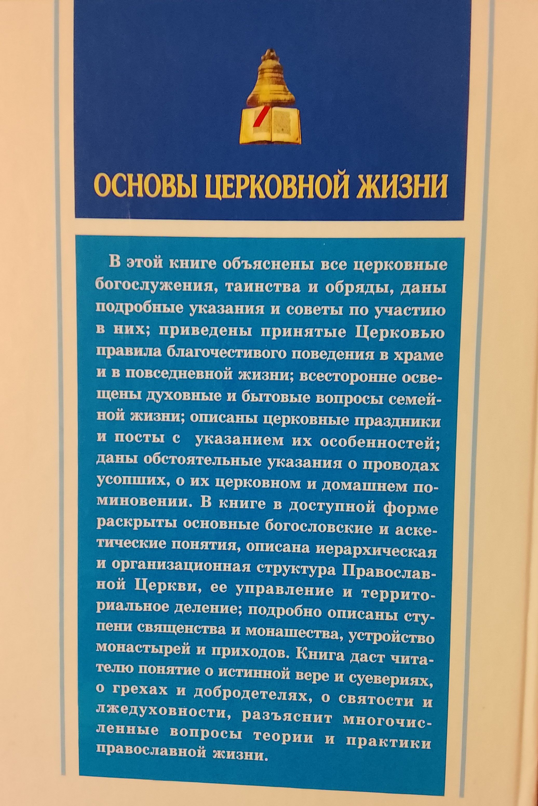 В этой книге объяснены церковные богослужения, таинства и обряды, даны подробные указания и советы по участию в них, приведены принятые Церковью правила благочестивого поведения в храме и в повседневной жизни; всесторонне освящены духовные и бытовые вопросы семейной жизни; описаны церковные праздники и посты с указанием их особенностей. В книге в доступной форме раскрыты основные богословские и аскетические понятия, описана иерархическая и организационная структура Православной Церкви, ее управление и территориальное деление; подробно описаны ступени священства и монашества, устройство монастырей и приходов. Книга даст читателю понятие о истинной вере и суевериях, о грехах и добродетелях, о святости и лжедуховности, разъяснит многочисленные вопросы теории и практики православной жизни.