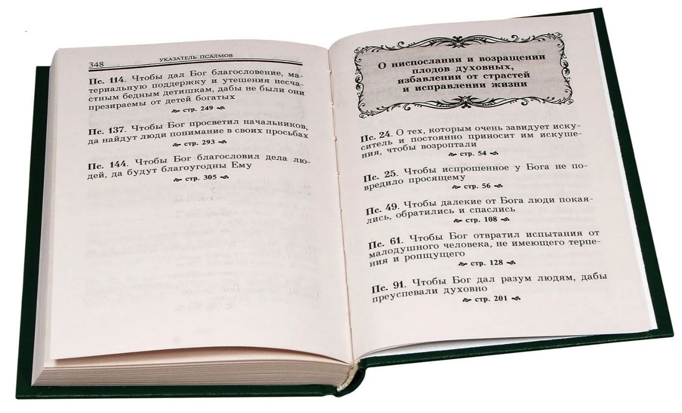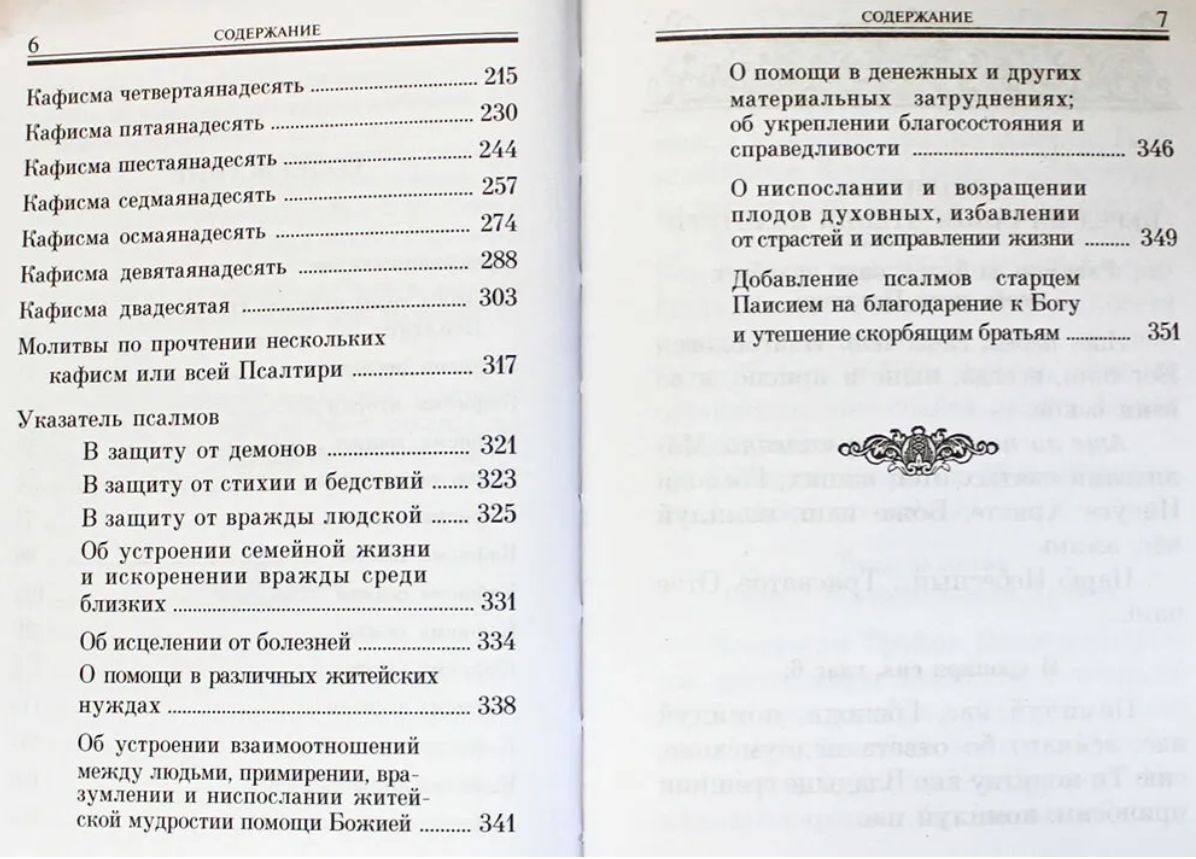 Указатель псалмов▪ В защиту от демонов — 319▪ В защиту от стихии и бедствий — 321▪ В защиту от вражды людской — 323▪ Об устроении семейной жизни и искоренении вражды среди близких — 329▪ Об исцелении от болезней — 332▪ О помощи в различных житейских нуждах — 336▪ Об устроении взаимоотношений между людьми, примирении, вразумлении и ниспослании житейской мудрости и помощи Божией — 339▪ О помощи в денежных и других материальных затруднениях; об укреплении благосостояния и справедливости — 344▪ О ниспослании и возращении плодов духовных, избавлении от страстей и исправлении жизни — 347▪ Добавление псалмов старцем Паисием на благодарение к Богу и утешение скорбящим братьям — 349