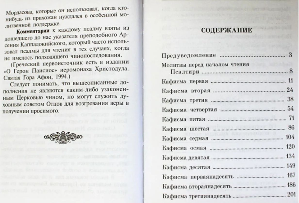 Кафисма первая — 7 Кафисма вторая — 19 Кафисма третия — 32 Кафисма четвертая — 48 Кафисма пятая — 63 Кафисма шестая — 77 Кафисма седмая — 94 Кафисма осмая — 109 Кафисма девятая — 122Кафисма десятая — 136 Кафисма перваянадесять — 154 Кафисма втораянадесять — 171 Кафисма третиянадесять — 185 Кафисма четвертаянадесять — 198 Кафисма пятаянадесять — 212 Кафисма шестаянадесять — 225 Кафисма седмаянадесять — 237 Кафисма осмаянадесять — 254 Кафисма девятаянадесять — 267 Кафисма двадесятая — 281