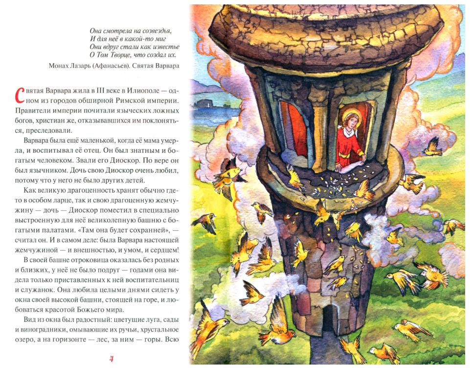 Город Илиополь, где жила святая Варвара, был крупнейшим центром поклонения языческим богам. Развалины его находятся сейчас на территории Ливана в шестидесяти пяти километрах к северо-востоку от Бейрута. Древнее название Илиополя - Баальбек связано с именем идола Ваала. Конечно, исповедовать Христа в этом языческом городе было опасно. Но святая Варвара, совсем молодая девушка, воспитанная практически в тепличных условиях, не устрашилась ни мучений, ни смерти. О том, как Варвара уверовала во Христа, как полюбила Его от всего сердца, как мужественно пострадала за свою веру, маленькие читатели узнают из этой книжки. Лучше понять и запомнить рассказ помогут красивые иллюстрации.
