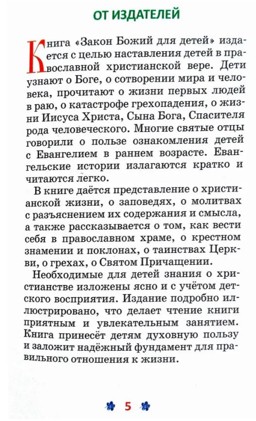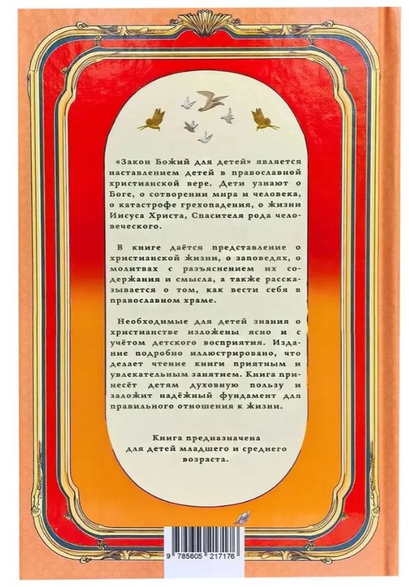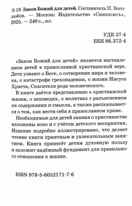 Книга «Закон Божий для детей» является наставлением детей в православной христианской вере. Дети узнают о Боге, о сотворении мира и человека, о катастрофе грехопадения, о жизни Иисуса Христа, Спасителя рода человеческого. В книге даётся представление о христианской жизни, о заповедях, о молитвах с разъяснением их содержания и смысла, а также рассказывается о том, как вести себя в православном храме. Необходимые для детей знания о христианстве изложены ясно и с учётом детского восприятия. Издание подробно иллюстрировано, что делает чтение книги приятным и увлекательным занятием. Книга принесет детям духовную пользу и заложит надёжный фундамент для правильного отношения к жизни. Рекомендовано к публикации Издательским советом Русской Православной Церкви. Книга предназначена для детей младшего и среднего возраста. Размер: 14 см × 22 см × 1,5 см Твердый переплет, офсетная бумага, 240 страниц.