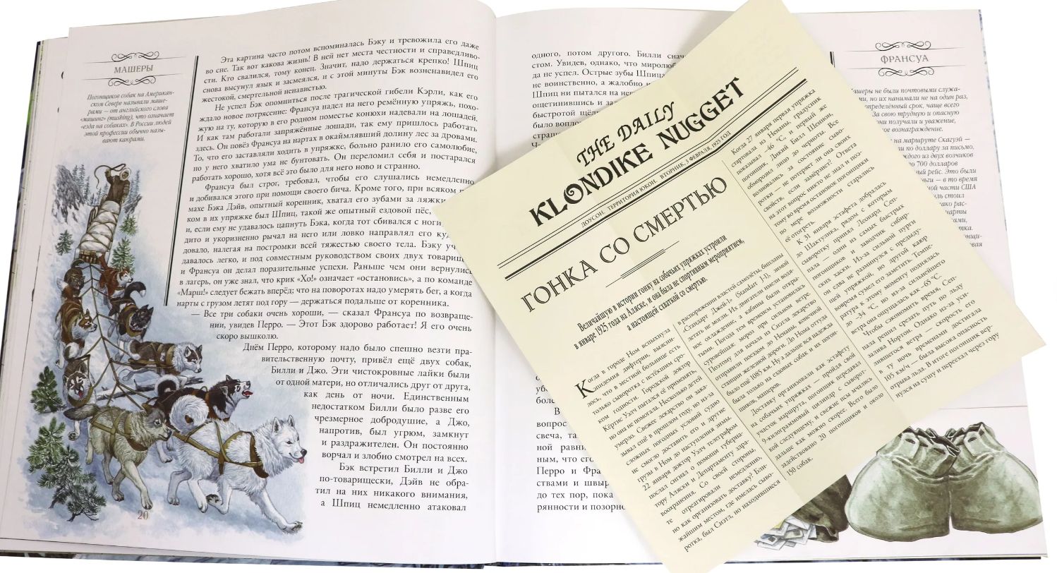 Эта красочная интерактивная книга станет замечательным подарком для детей (и для мальчика, и для девочки) и для взрослых ценителей необычных изданий. Она, конечно, входит в программу внеклассного чтения, но и просто хороша для младших школьников и подростков как собрание увлекательных фактов о Клондайке, золотоискателях и животных Севера. Среди книг для детей о путешествиях и приключениях это издание стоит особняком. Объемные и подвижные бумажные элементы чем-то напоминают детские книжки — панорамки XX века, но в уникальном формате смотрятся особенно привлекательно и необычно.
